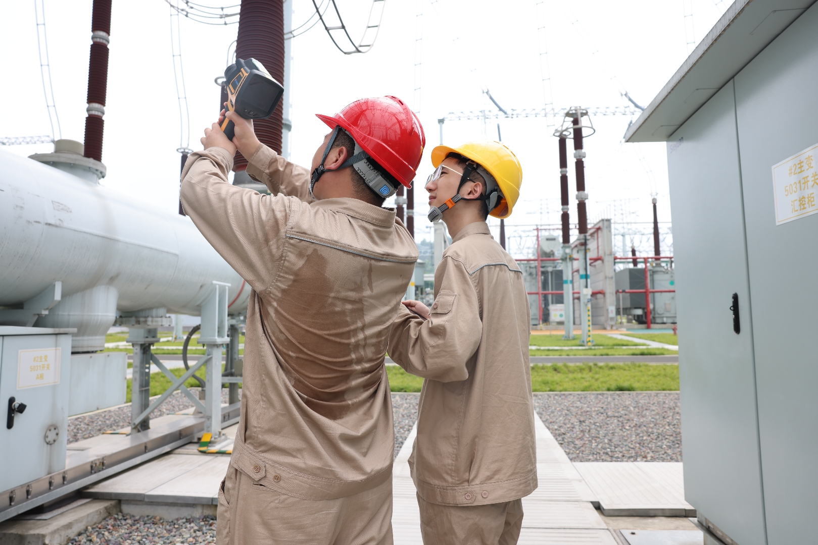 高温天气下,国网乐山供电变电运维中心值班员对站内重心保电透露开展红外测温。(肖力姝 摄)