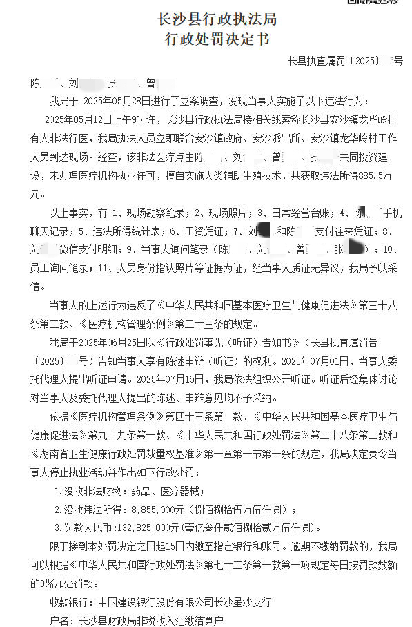 8月23日,记者从长沙市开福区东说念主民政府官网获悉:长沙市开福区针对此案件共立案4起,均下达行政处罚决定书,对涉案5东说念主作出行政处罚。其中,两名开办者被充公涉案药品器械、充公违警所得167.9万元,罚金2518.5万元;又名大夫被警戒、充公违警所得11.75万元,罚金3万元,暂停执业举止一年;又名照顾被充公违警所得6万元;又名现实室东说念主员被充公违警所得1万元。
