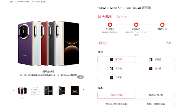 快科技11月19日音讯赌钱赚钱app,华为新一代折叠屏手机Mate X7今天12:08认真开启预订,将于11月25日的发布会上登场。