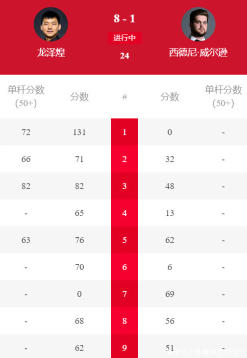 具体到龙泽煌与西德尼-威尔逊的这场世锦赛阅历赛第一轮,龙泽煌在第一阶段的四杆50+,取得8-1的跨越上风。