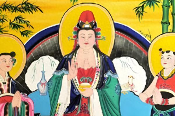 其次,不雅音菩萨邀请黎山老母后,与文殊菩萨、普贤菩萨都自甘化成黎山老母的3个男儿,真真、爱爱、怜怜;